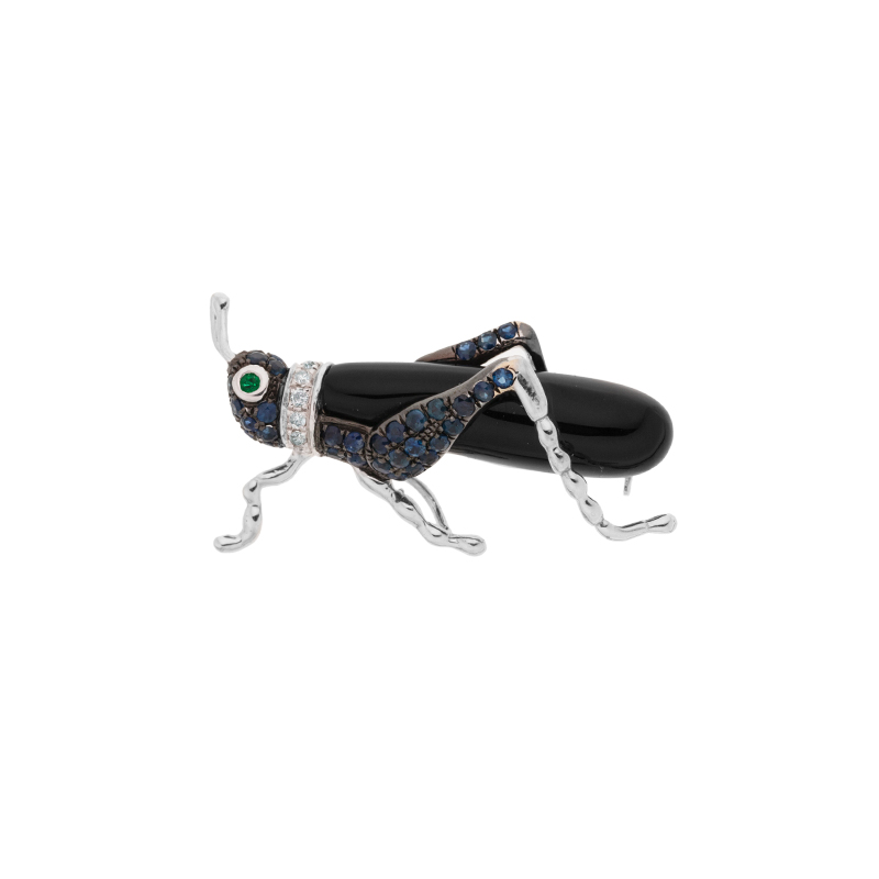 Brož z bílého zlata se safíry, smaragdy, onyxem a diamanty. Délka 3,50cm