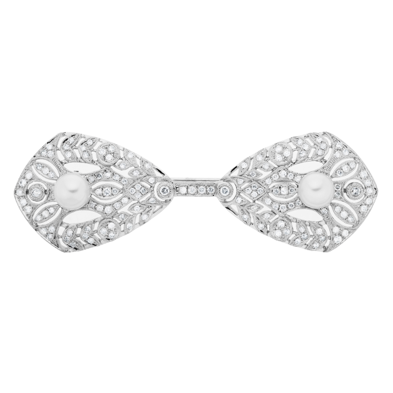 • detail Brož z bílého zlata ve stylu art deco s perlami a diamanty. Délka 7cm