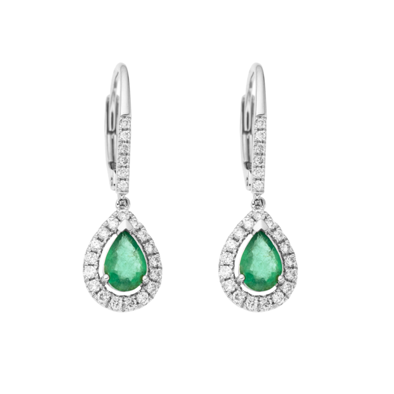Náušnice z bílého zlata s diamanty a smaragdy. Celková výška 2,70cm