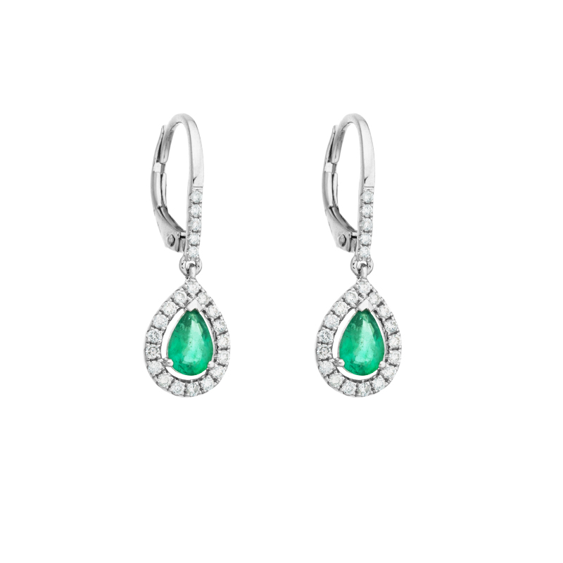 • detail Náušnice z bílého zlata se smaragdy a diamanty. Celková délka 2,50cm
