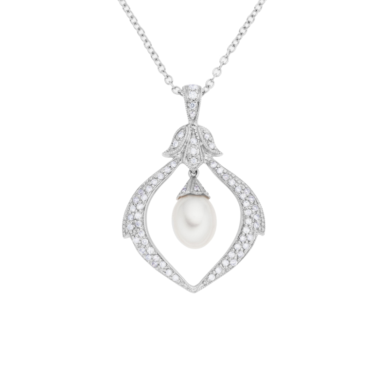 • detail Přívěsek z bílého zlata s diamanty a perlou. Délka řetízku 44cm