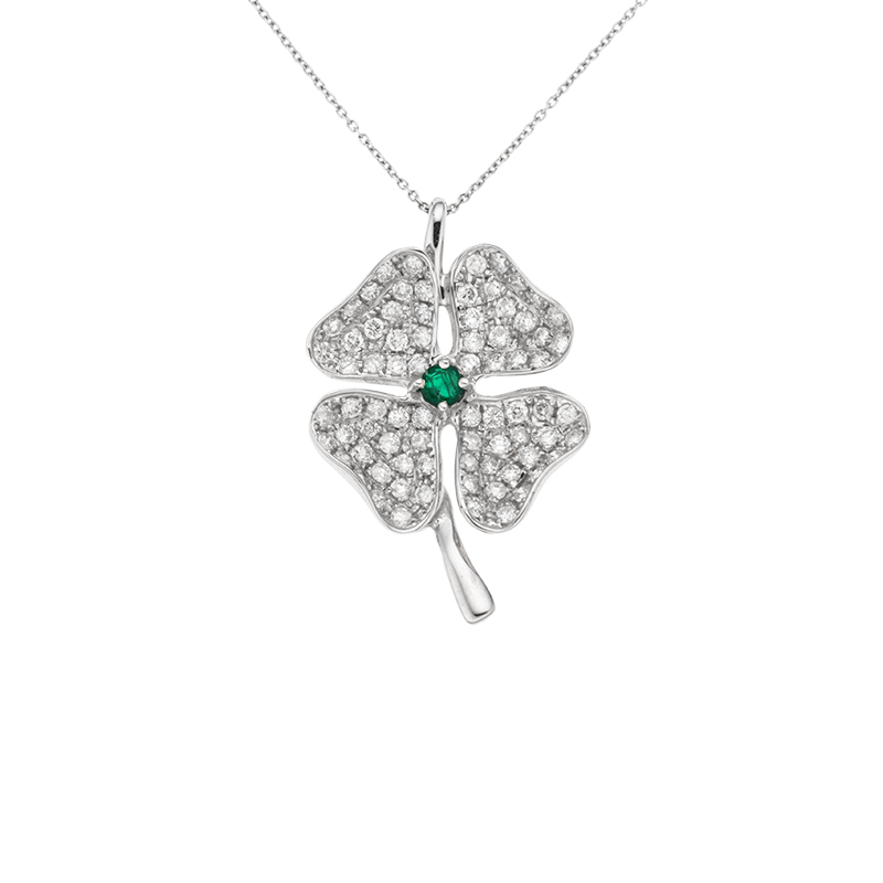 Přívěsek z bílého zlata se smaragdem a diamanty. Délka řetízku 45,5cm