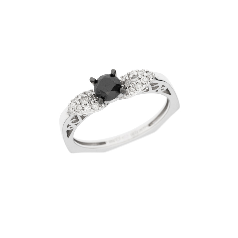 • detail Prsten z bílého zlata s černým a bílými diamanty. Zajímaný hraněný tvar