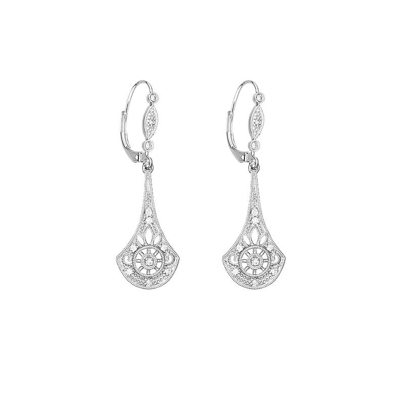 • detail Visací náušnice z bílého zlata s diamanty. Celková délka 4,10cm, art deco styl